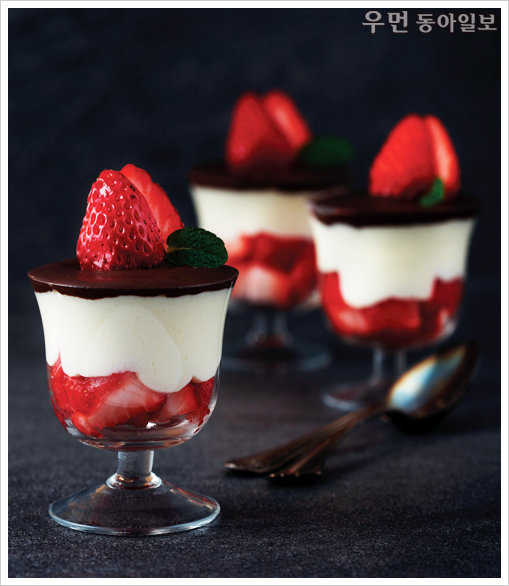 How to make 1 딸기는 꼭지를 제거한 뒤 20개는 깍둑썰고, 4개는 길이로 2등분한다. 2 크림치즈를 믹서에 넣어 부드럽게 섞은 뒤 생크림, 설탕, 레몬즙을 넣고 휘핑한다. 3 다크초콜릿은 잘게 잘라 중탕으로 녹인다. 4 유리컵에 깍둑썬 딸기를 절반 정도 채운 뒤 ②를 0.5cm 정도 남기고 편편하게 채운다. 5 ④에 녹인 초콜릿을 올리고 길이로 썬 딸기와 민트로 장식한다.