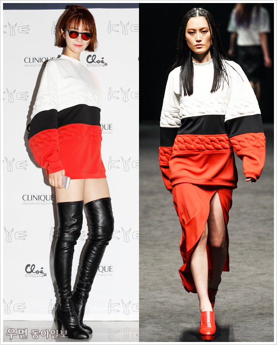 고준희 화이트᠊블랙᠊레드 3가지 컬러 구성이 돋보이는 맨투맨 티셔츠. 흑백의 단조로움을 없애기 위해 강렬한 레드 컬러를 아래쪽에 배색했다. 군데군데 보이는 엠보 처리는 오버사이즈 실루엣을 제대로 살려준다. 티셔츠는 이날 쇼에 오른 디자이너 브랜드 카이(KYE)의 2014 F/W 제품이다. 고준희는 쇼와는 달리 블랙 쇼트 팬츠와 사이 하이 부츠로 시크한 무드를 연출했다. 맨투맨 티셔츠도 그가 입으니 이토록 섹시하다.