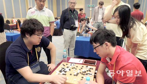 한국에 바둑 유학을 온 베트남 소년 보녁밍 아마 2단(왼쪽)이 8일 이스라엘의 프라그만 아미르 아마 4단(22)과 대국하는 모습. 보녁밍은 패했다. 경주=윤양섭 기자 lailai@donga.com