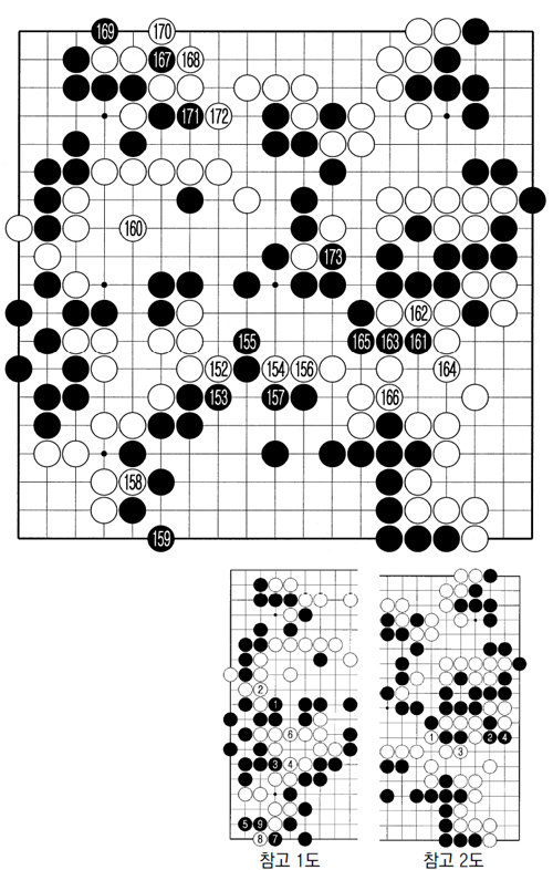 154는 실속이 없다. 흑이 155로 반발하니 156으로 물러서야 했기 때문이다. 158에 대해 159로 둔 것은 패의 여지를 남겨놓은 수. 참고 1도처럼 흑 5로 치중하면 흑 9까지 패가 된다. 실전에서는 흑이 집으로도 유리해 패를 결행하지 않았다.
