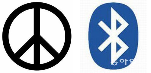 평화의 상징: 1950년대 영국의 디자이너가 반핵운동을 위해 만들었다. 사람이 양팔을 내린 모양새(왼쪽). 블루투스: 10세기 통일에 힘쓴 덴마크 왕 해럴드 블루투스의 약어 HB를 북유럽 고대 문자로 표현했다.