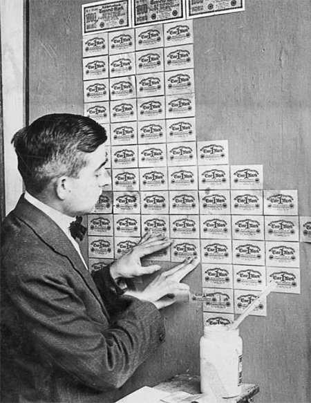 제1차 세계대전 이후 바이마르 공화국에서 한 독일인이 가치가 폭락한 지폐를 벽지로 바르고 있다. 당시 엄청난 인플레이션으로 지폐로 벽지를 사는 것보다 지폐를 벽지로 쓰는 것이 더 저렴했다. 21세기북스 제공