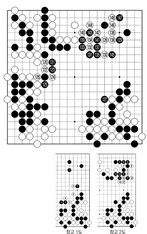128은 급소이고, 129의 응수는 정수다. 백은 130으로 우변과 중앙 흑 모양을 견제했다. 131도 좋은 감각이다. 백을 움츠리게 만들어 흑도 기분을 내는 장면이다. 흑이 135로 붙여오자 백은 136으로 반격한다. 137 대신 참고 2도처럼 흑 1로 두기는 어렵다. 백 2부터 백 16까지 우변 흑진이 초토화되기 때문이다.