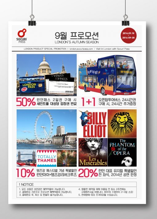 프로모션에서는 런던패스 2일권을 구매하면 세인트폴 대성당 입장권을 50% 할인 가격으로 제공하며, 오픈탑투어버스 24시간권 구매시에는 24시간 이용권을 추가로 증정한다. 런던아이와 템즈강 리버크루즈 탑승권을 함께 구매하면 10% 할인한다. 런던 대표 뮤지컬의 전 좌석도 20% 할인 판매한다. 소쿠리패스 본사를 방문하고 페이스북 좋아요를 인증하면 한정판 오이스터 카드 홀더와 튜브맵을 증정하는 오프라인 이벤트도 진행하고 있다.