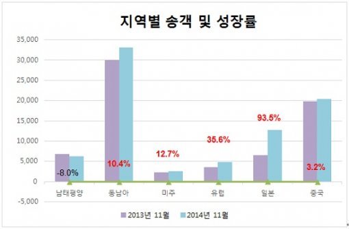 지난해의 부진을 만회하듯 일본은 90%가 넘는 성장률을 보이며 하계성수기 이후 단연 독보적인 성장지역으로 나타났다. 식을 줄 모르는 유럽인기도 꾸준한 가운데 동남아가 지난달에 이어 두 달 연속 플러스 성장을 기록했다는 것이 고무적이다. 성공적으로 막을 내린 모두투어 박람회 현장 모객이 호조를 보인 것도 11월 실적에 긍정적인 영향을 미친 것으로 조사되었다.