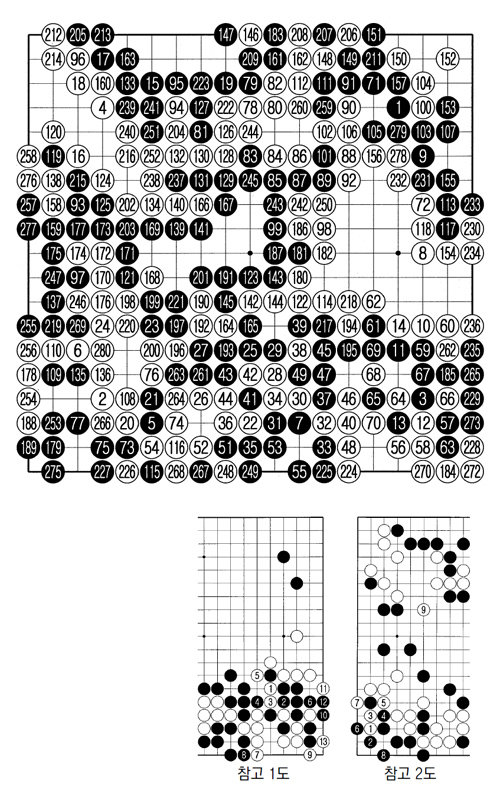 이후 백은 상변에서 실수로 흑의 추격을 허용했다. 결정적인 패착은 중앙을 부수기 위해 둔 134였다. 이 수는 좌하귀에서 먼저 큰 끝내기를 했어야 했다. 참고 2도처럼 백 1로 붙일 곳. 흑은 흑 2로 두어 흑 8까지 살아야 한다. 이때 백 9로 뒀으면 백이 불리하지 않은 형세. 이후 흑은 여러 차례 백의 승부수를 따돌리며 승리했다.