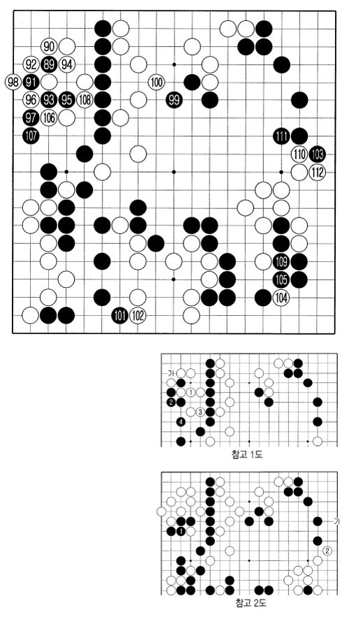 흑 ‘가’로 끊으면 백의 사활에 문제가 생기기 때문이다. 바둑에서 때론 물러서고, 때론 돌아가는 길이 더 나을 때가 많다. 이어 백은 96, 98까지 두는 것이 최선이다.