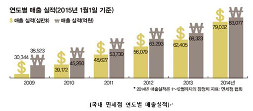 현재 국내 면세점은 2014년 기준 시내 면세점 17개, 출국장 면세점 20개 등 총 43개이다. 면세점 매출은 지난해 8조377억원으로 2013년에 비해 1조4754억원이나 증가하는 가파른 상승세를 보이고 있다. 이중 시내면세점의 매출 비중이 전체의 70%여서 서울 시내 면세점 사업자 선정을 앞두고 벌써부터 기업간에 치열한 경쟁이 벌어지고 있다.