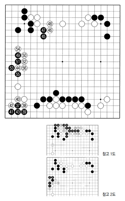 흑은 47로 밀어둔 뒤 49로 좌변을 한껏 벌렸다. 45와 호응해 제법 큰 집 모양을 만들었다. 50으로 붙인 게 과수. 참고 2도처럼 백 1로 밑으로 붙이는 수가 무난했다. 흑 2, 4로 반발하겠지만 백 5부터 백 9까지 받아줘 아직은 팽팽한 형세. 이 그림은 실전에서 45-49로 만들어진 큰 모양을 자연스럽게 지웠다. 51로 치받고 53으로 젖히자 마땅한 응수가 없다. 백이 물러서 받는다면 흑은 계속 밀고 들어올 것이고, 백 집이 많이 깨진다. 백은 54로 반발했고 흑은 55로 단수했다. 백도 56으로 이었다. 좌변에서 갑자기 승부의 호흡이 가팔라졌다. 초반 승부처를 맞은 두 대국자.