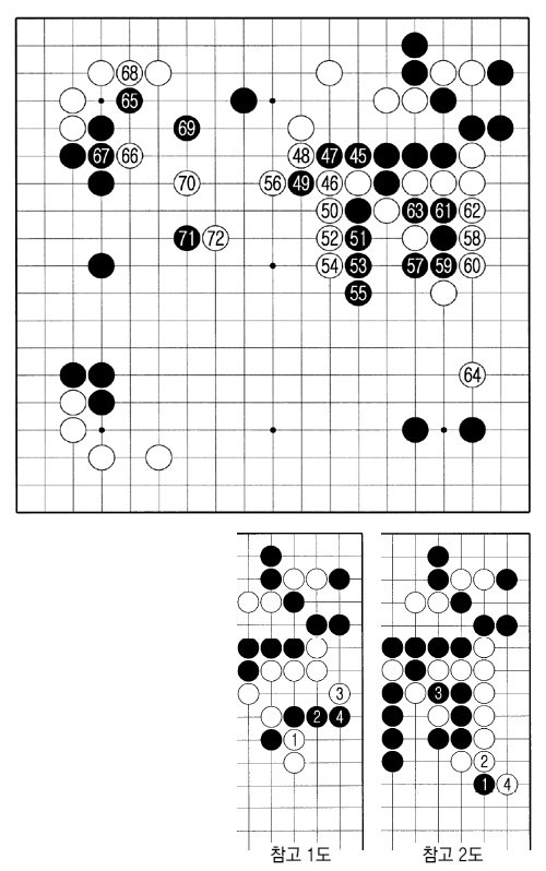 흑 63이 약간 성급했다. 참고 2도 흑 1을 선수할 자리. 끊을 수 있는 곳을 이렇게 들여다봐서 이어주는 건 금기에 가깝지만 실전처럼 백 64로 시원하게 모양을 잡는 것보단 참고 2도가 흑에겐 훨씬 낫다. 백 64까지 중앙과 우변에서 백이 모양을 잘 갖춰 백이 앞서기 시작한다. 백 70은 상변 흑 돌의 연결을 강요하는 수인데 흑은 71로 반발한다. 여기서 조 9단의 선택은 백 72. 중반전의 고비다.