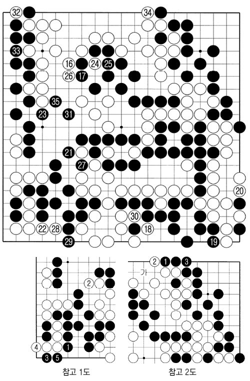 백 32로 먹여칠 때 흑 33으로 받는 것이 정수. 백 한 점을 따내면 백이 33의 자리에 두는 것이 선수가 된다. 백 34도 생각보단 큰 수. 백이 두지 않으면 흑이 참고 2도 1, 3으로 둔다. 나중에 ‘가’로 치중하는 수가 있어 백은 어떤 식으로든 가일수를 해야 한다.