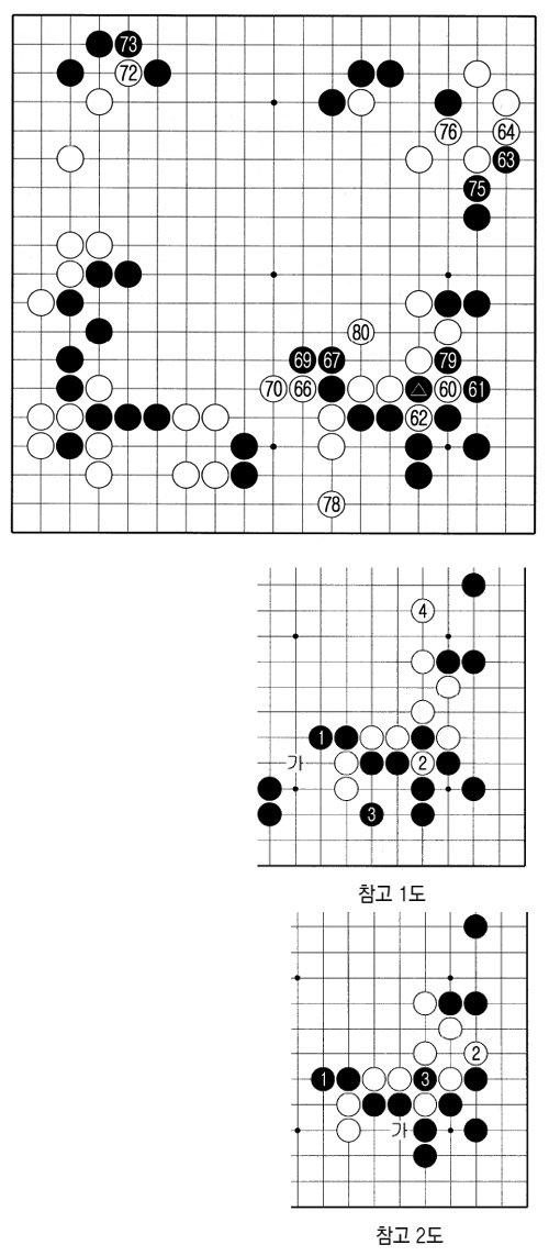 흑의 끊음에 백 60으로 단수해 강하게 버티는 백. 흑 61로 참고 1도처럼 하변을 빨리 제압하고 싶지만 백 2, 4로 우변 흑 석 점이 곤궁해진다. 살더라도 악수를 많이 두고 살아야 한다. 하변도 ‘가’로 가르는 뒷맛이 남아 흑이 좋지 않다. 흑 61은 우변 건너는 수를 확보하는 의미도 있다.