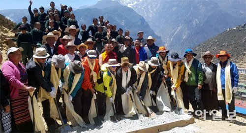 지난달 25일 네팔 쿰부 히말라야 남체바자르 마을에서 열린 종합병원 기공식에서 산악인 엄홍길 대장(앞줄 왼쪽에서 일곱 번째)과 마을 주민 등이 첫 삽을 뜨고 있다. 남체바자르=윤수민 채널A 기자 soom@donga.com