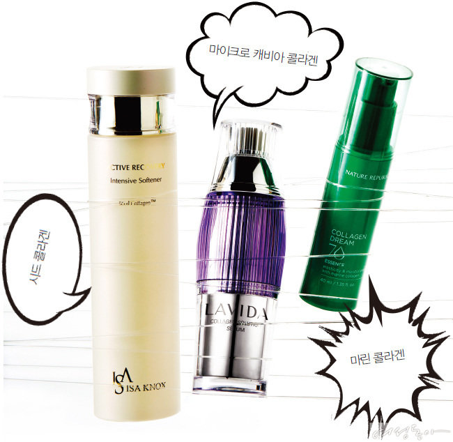 전문가들은 피부 탄력을 떨어뜨리고 굵은 주름을 만드는 가장 핵심적인 요인으로 콜라겐 파괴를 꼽는다. 콜라겐은 피부 진피 성분의 70%를 차지하면서 피부 강도와 탄력성을 좌우하기 때문. 피부 속 콜라겐이 파괴되는 것을 막을 수는 없지만 충전은 가능하다. 화장이 쉽게 뜨고, 트러블이 자주 생기거나, 피부 건조를 느낀다면 콜라겐이 부족하다는 신호. 식품이나 분말, 액상 형태로 판매되고 있는 먹는 콜라겐은 물론 피부에 직접 바르는 콜라겐 화장품 등 다양한 형태의 콜라겐이 있으니 어떤 종류로라도 보충하는 것이 좋다. 특히 요즘 출시되는 콜라겐 화장품은 시드 콜라겐, 베이비 콜라겐, 캐비아 콜라겐, 발효 콜라겐 등 특성이 세분화되어 있어, 피부 타입이나 취향에 따라 골라 쓸 수 있는 선택의 폭이 넓다.