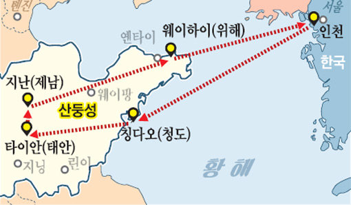 공자 맹자 손자 강태공 나관중 왕희지 장보고…. 중국 산둥성은 ‘인물의 고장’이다. 지리적으로는 우리나라와 가깝다. 오죽했으면 산둥성의 닭 울음소리가 인천까지 들린다고 했을까. 땅 생김새도 낯설지 않다. 이웃 같다. 한반도의 고대인들은 황해의 뱃길을 통해 옛 중국과 많이 교류했다. 스님 학자 상인 등 수많은 사람들이 ‘차이나 드림’을 꿈꾸며 황해를 건넜다. 고대인의 숨결을 느끼며 산둥성 깊숙이 들어가 보자. 한반도 고대인들이 건넜던 뱃길을 이용해 인천-칭다오(청도)-타이안 태산(泰山)-지난(제남)-웨이하이(위해)-인천으로 이어지는 4박5일 코스다.
