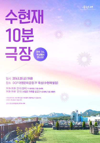 ‘옥상에서 즐기는 신개념 연극’을 표방한 수현재 10분 극장의 첫 무대가 20일 오후 7시, 서울 대학로 DCF 대명문화공장 건물 옥상에서 열린다. 공연제작사 수현재컴퍼니는 “공연장에 일찍 도착한 관객에게 새로운 형태의 재미를 선사하는 동시에 젊은 창작진에게 공연의 기회를 제공하기 위해 옥상 연극을 기획했다”고 설명했다. 무대는 별도의 세트없이 야외카페처럼 꾸민 옥상정원을 활용한다. 간단한 조명과 스피커가 무대장치의 전부이다. 매주 금요일 오후 7시부터 10분 분량의 단막극 두 편을 선보인다. 20일 첫 무대를 장식할 작품은 죽은 남편의 짐을 정리하는 엄마와 아들의 대화로 구성된 연극 ‘정리’와 옛 연인을 추억하는 남자와 여자 이야기를 다룬 ‘사랑은 가루를 싣고’이다. 이들 공연은 사전예약없이 누구나 무료로 자유롭게 관람할 수 있다. 야외공연이므로 우천 시는 취소된다.