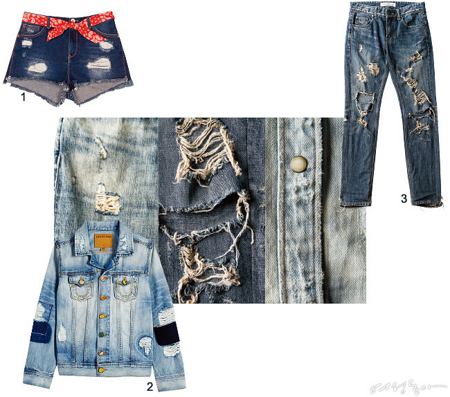 1 긴 바지를 자른 듯 거친 마무리의 쇼츠. 3만9천원 스트라디바리우스. 2 단추까지 녹슬도록 연출한 재킷. 가격미정 트루릴리전. 3 몇 십 년 전의 빈티지를 보는 듯 해진 팬츠. 14만9천원 플랙.