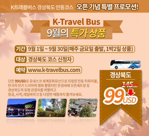 K트래블 버스를 운영하는 한국방문위원회는 9월부터 경북 안동 지역을 새로 운행하는 것을 기념해 경상북도 코스를 대상으로‘9월 한정 99달러’프로모션을 실시한다. 10월에는 코리아그랜드세일 기념 프로모션으로 노선별‘최대 50% 할인’을 제공한다. 11월에는 버스 이용객에게 인기가 높은 전라남도 코스를 대상으로 99달러 프로모션을 진행한다. 추석연휴 기간에 이용하는 외국인 관광객에게는 복주머니 등 다양한 선물을 준다. K트래블버스는 강원, 대구, 전남, 경북, 동남권(부산, 울산, 경남)과 올해의 관광도시 무주, 제천 등 6개 권역으로 매주 운행하는 여행상품이다. 미화 145∼175달러의 요금 속에 교통, 숙박, 통역가이드, 관광지 입장료 및 체험료 등이 포함된 일체형 상품이다. 이번 가을 프로모션 기간에는 외국인과 동행시 내국인도 한시적으로 K트래블 버스 이용이 가능하다.