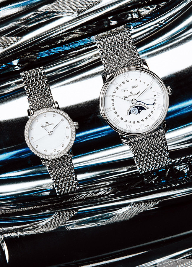 BLANCPAIN 우먼 울트라 슬림 화이트 다이얼과 다이아몬드 인덱스, 그리고 은하수를 형상화한 브릴리언트 컷 다이아몬드의 어우러짐이 고상하다. 유광 스테인리스 스틸 브레이슬릿으로 세련된 품격까지 더했다. 작은 우주라 불리는 정교한 무브먼트는 남성용 못지않게 복잡미묘한 움직임을 공유하는 훌륭한 메커니즘을 지닌다. 1천8백93만원. BLANCPAIN 빌레레 컴플리트 캘린더 명료함의 진수, 블랑팡의 대표적인 모델 빌레레의 논조는 언제나 분명하다. 간결함이 돋보이는 화이트 다이얼과 로만 인덱스, 12시 방향의 날짜 창과 요일 창 모두 균형 있게 짜여 있다. 다소 복작복작할 수 있는 문페이즈도 브랜드 특유의 실용성을 거쳐 간결하게 완성됐다. 여기에 스테인리스 스틸 브레이슬릿이 찬란한 빛을 더했다.