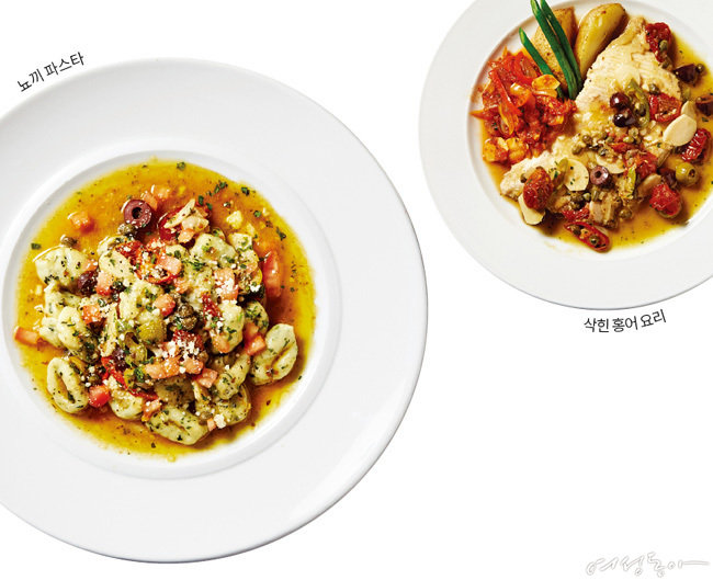 두 번째 음식은 삭힌 홍어 요리입니다. ‘삭힌 홍어’라고 하면 손사래를 치는 분들이 많을텐데 지중해식으로 조리한 이 요리는 홍어 특유의 냄새가 거의 나지 않습니다. 호텔에서 근무할 때 제가 개발해 손님들에게 큰 사랑을 받아온 저의 베스트 메뉴죠. 이 요리의 특징은 이탈리아 요리를 한국화했다는 점이에요. 포인트는 이탈리아산 멸치 젓갈인 안초비로 간을 맞춘다는 건데요. 소스는 분명 지중해식입니다만, 멸치 육수는 우리에게도 친숙한 맛이라 은근히 중독성이 있어요.