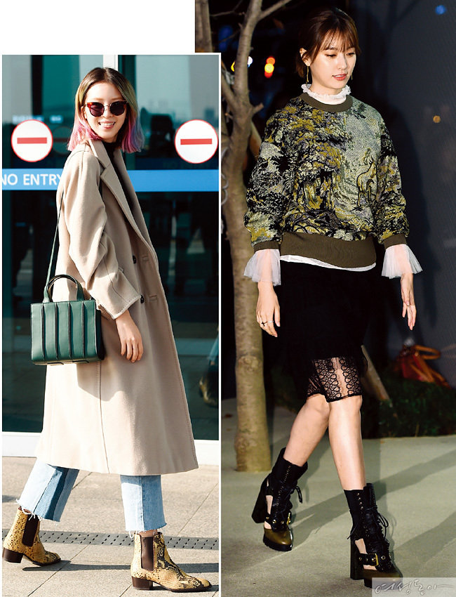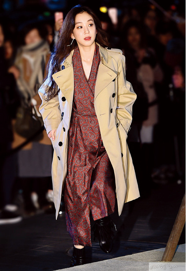 로브 드레스에 트렌치코트를 걸치고 술 장식 앵클부츠로 마무리한 정려원. 자유로운 보헤미안 걸이다.