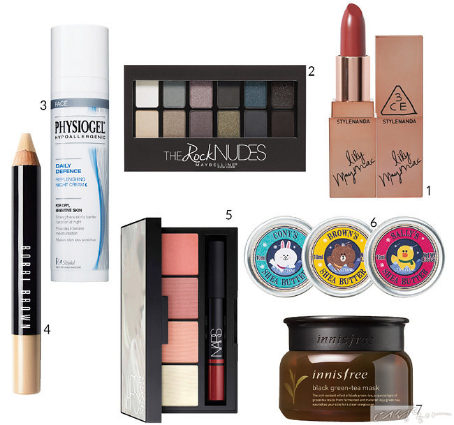 사진제공 나스(02-6905-3747) 록시땅(02-511-2427) 메이블린뉴욕(080-565-5678) 바비브라운(02-3440-2781) 이니스프리(080-380-0114) 피지오겔(080-901-4100) 3CE(0502-707-8888) 디자인 이지은