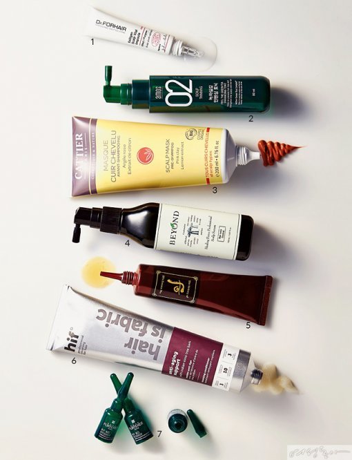 1 Dr.FORHAIR 폴리젠 스칼프 바이탈 앰플 정수리 전용 앰풀로 튜브형이라 두피에 바르기 편리하다. 각질층의 과도한 증식을 예방하고, 각질을 부드럽게 제거해주며 두피에 보습을 더해 탈모를 방지하고 모발 굵기에 도움을 준다. 15ml 1만2천원. 2 아모스프로페셔널 녹차실감 인헨싱 토닉 탈모 방지 및 모발 굵기 개선을 돕는 의약외품으로 모근 강화 , 두피 순환, 모발 탄력 증가에 도움을 준다. 80ml 3만원대. 3 까띠에by온뜨레 핑크 클레이 스칼프 마스크 자극 없이 두피 노폐물을 제거하는 두피 전용 마스크팩으로 핑크 클레이가 스케일링 효과를, 유기농 레몬 추출물이 두피 피지 조절과 함께 민감해진 피부를 진정시킨다. 200ml 4만3천원. 4 비욘드 힐링 포스 프로페셔널 스캘프 세럼 특허받은 천연 추출물이 두피와 모발을 건강하게 가꿔주는 두피 전용 에센스. 150ml 3만3천9백원. 5 더 히스토리 오브 후 후스파 모액 에센스 탈모 방지 효능으로 특허 받은 고삼 추출물을 함유한 탈모 방지 및 모발 성장 촉진 기능 에센스. 50ml 6만2천원. 6 히프 안티에이징 서포트 클렌징 컨디셔너 인디안 키노 나무 껍질이 함유돼 모근부터 모발을 보호하며 모발 성장 주기를 회복시킨다. 180ml 5만원. 7 르네휘테르 RF80 ATP 모발 강화 트리트먼트 앰풀로 식물성 펩타이드 성분이 모발 성장을 촉진하고 두피 강화에 도움을 준다. 5ml×12 7만8천원.