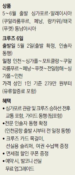 레드캡투어에서 최초로 시도되는 골프와 결합된 크루즈 여행은 5월 연휴 기간 한정이며 가격은 279만 원부터이다. 요금에는 전체 기항지 관광과 싱가포르 호텔 1박이 모두 포함되어 있고 별도의 옵션 팁이 없다. 또한 예약 고객은 발코니 선실 무료 업그레이드 혜택을 받을 수 있다.