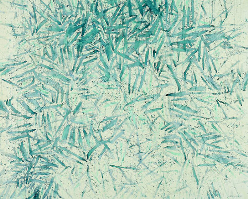 ▲‘얼레짓 86-801’, 1986년작. 화폭에 무작위로 그려진 선들은 갇히지 않은 자유로움을 나타낸다. 제4전시장의 ‘얼레짓’은 1980년대의 작업이다. ‘얼레짓’은 연을 날릴 때 쓰이는 도구인 ‘얼레’와 행위를 나타내는 ‘짓’을 합친 말이다. 연을 날릴 때의 움직임에 따라 연의 형태가 변하듯 선들이 무작위로 화폭에 펼쳐지면서, 바람에 흔들리는 나무인 듯 복잡다단한 사람의 마음인 듯 어느 하나로 규정될 수 없는 자유로운 모양을 만들어낸다. 동서양의 화풍이 교차하는 그의 작품 세계는 1990년대 이후 자연을 배경으로 삼은 그림들을 내놓으면서 깊어진다. 제3전시장의 ‘익명의 땅’ 연작에서는 300∼500호의 대형 화폭에 담은 자연의 거대한 에너지를, 2000년대 이후 집중하고 있는 ‘겸재예찬’ 연작(제2전시장)에서는 진경산수를 창안한 겸재로부터 받은 영감과 자연에 대한 외경을 함께 확인할 수 있다. 대학 졸업 뒤 한국판화가협회를 창립하고 미국에서 판화를 공부하는 등 1960, 70년대 한국 현대판화의 초기 정립에 기여한 작가답게 최근 판화 작품들도 3층 소전시장에 선보였다.