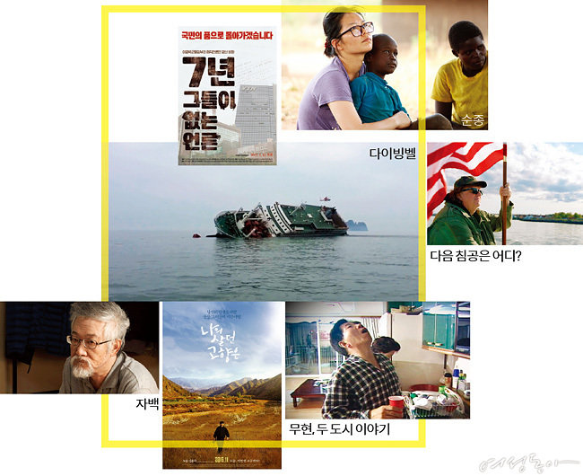 요즘 다큐멘터리 영화에 대한 관심이 심상치 않다. 영화진흥위원회 자료에 따르면, 2016년 극장가에 개봉을 알린 다큐멘터리 영화는 총 스물다섯 편. 그중 10월에 개봉한 〈자백〉과 〈무현, 두 도시 이야기〉는 각각 14만과 19만 관객을 돌파했다(2016년 12월 18일 기준). 통상 1만 관객을 모으기 어렵다는 다큐멘터리 영화에서 괄목할 만한 성적을 낸 이 두 영화는 모두 정치적인 이슈를 담고 있다. 〈자백〉은 탐사보도 전문매체 〈뉴스타파〉의 최승호 PD가 ‘국정원 간첩 조작사건’을 취재하는 과정을 영화화한 다큐멘터리. 〈무현, 두 도시 이야기〉는 2000년 부산의 지역구 국회의원 선거에서 낙선한 故 노무현 전 대통령의 이야기와 2016년 4월 13일 총선에서 낙선한 뒤 사망한 더불어민주당 故 백무현 후보의 이야기를 다룬다. 지난 11월 24일 개봉한 도올 김용옥 교수의 역사 다큐멘터리 〈나의 살던 고향은〉은 최근 논란이 된 국정 교과서 문제와 맞물리며 화제를 모으고 있다. 최근에는 ‘세월호 사고’를 다룬 다큐멘터리 영화 〈다이빙벨〉이 TV에 방영되기도 했다. 이 영화는 지난 2014년 부산국제영화제 상영작품이었으나 당시 문화체육관광부의 상영 반대로 ‘부산국제영화제’ 외압설이 돌면서 논란에 휩싸였던 작품이다. 오는 1월 12일에는 언론 탄압과 싸움의 역사를 담고 있는 영화 〈7년-그들이 없는 언론〉이 개봉한다. 전주국제영화제 상영작이며 디엠지(DMZ)국제다큐멘터리영화제에서 최우수 한국다큐멘터리상과 관객상을 받은 작품이다.