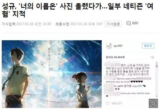 그런가 하면 그룹 인피니트의 성규가 자신의 인스타그램에 '너의 이름은'포스터를 올리자 ‘여혐 재생산’이라며 불쾌감을 드러내는 누리꾼도 있었다.