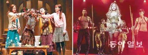 남편의 보험금을 타기 위해 네 명의 아줌마가 각자의 남편으로 변장하며 벌어지는 소동을 유쾌하게 그린 연극 ‘꽃의 비밀’(왼쪽)과 익숙한 음악과 화려한 무대로 눈과 귀를 사로잡는 뮤지컬 ‘보디가드’. 동아일보DB