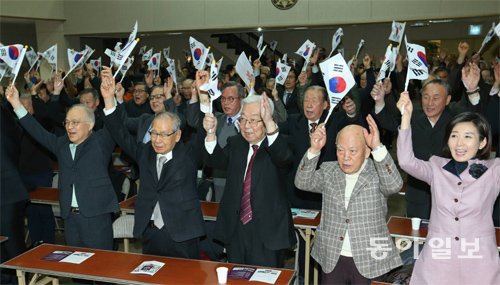 일제강점기 항일민족운동 단체로는 규모가 가장 컸던 신간회 창립 90주년 기념식이 15일 서울 종로구 YMCA회관에서 열렸다. 앞줄 왼쪽부터 강지원 신간회기념사업회장, 김진현 세계평화포럼 이사장, 이상복 월남이상재기념사업회장, 유동준 정조대왕기념사업회장, 나경원 자유한국당 의원 등 참석자들이 만세삼창을 하고 있다.