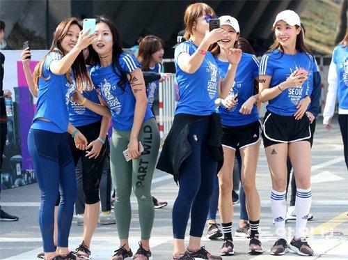 봄바람을 타고 매 주말에 전국 곳곳에서는 각종 마라톤대회가 열리고 있다. 특히 10km 마라톤에는 젊은 남녀가 대거 몰리면서 다양한 패션이 연출되고 있다. 달리기 편한 ‘기능성’을 감안하고 색다른 감각을 연출하는 젊은이들이 10km 마라톤을 접수하면서 나타난 현상이다. 사진은 지난달 19일 열린 2017 서울국제마라톤 겸 제88회 동아마라톤의 마스터스 10km 부문에 참가한 여성들이 출발 전 ‘셀카’를 찍고 있는 모습. 장승윤 기자 tomato99@donga.com