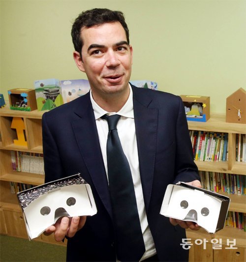 11일 국립중앙박물관 어린이박물관에서 만난 로랑 가보 구글 아트앤드컬처 연구소장(41)은 “구글 카드보드의 탄생 비화를 들려주겠다”며 유쾌한 웃음을 지었다. 카드보드는 별도의 기계 없이도 스마트폰을 끼워 VR 영상을 즐길 수 있는 골판지 상자. 누구나 손쉽게 사용할 수 있는 VR 기기를 고민하던 개발자 두 명이 어느 날 연구소에서 피자를 주문했다. 이들은 피자가 담긴 배달 박스를 보고 “값싼 골판지를 사용해 VR 기기를 만들면 어떨까”라는 아이디어를 퍼뜩 얻었다는 것이다. 구글은 2014년 카드보드 제작법을 인터넷에 무료로 공개했다.