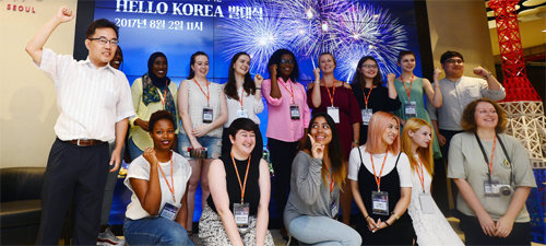 2일 오전 서울 중구 을지로 그레뱅뮤지엄에서 열린 ‘한국관광공사 유럽·미주지역 SNS(소셜네트워크서비스) 기자단 발대식’에서 외국인 참가자들이 기념촬영을 하고 있다. 관광공사는 방한 관광객 유치를 위해 국내에 거주하는 유럽·미주 지역의 유학생 18명을 기자단으로 최종 선발했다.