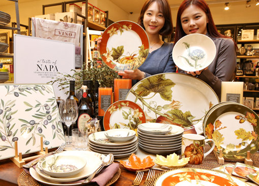13일 현대백화점 목동점 지하 1층 윌리엄스 소노마 매장에서 직원들이 ‘나파 디너웨어 컬렉션’을 선보이고 있다. 미국 대표 와인 생산지인 나파 밸리의 풍경을 담아 볼과 접시 등 11종으로 구성했으며 나파 밸리에서 서식하는 올리브 나무, 오키드 꽃, 아열대 식물 등을 제품 디자인에 활용했다.