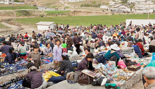 북한의 장마당(시장)은 북한 민간 경제에서 없어선 안 될 요소가 됐다. 저자는 시장화가 본격화됨으로써 주민들에 대한 통제력을 잃어가는 북한 정권이 이를 만회하기 위한 방법으로 선택한 것이 선군정치라는 분석을 내놓는다. 사진은 상인과 손님들로 붐비는 북한 시골의 한 장마당 모습. 사진 출처 미국의소리