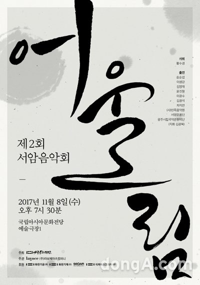 또한, 사물놀이 창시자이자 비나리 명인 이광수와 국내 최고의 기타리스트 김광석과의 이색적인 무대와 전통과 현대의 아름다운 하모니는 창의적인 어울림의 미학을 선사하며 제2회 서암음악회의 마지막을 화려하게 수놓을 것으로 보인다.
