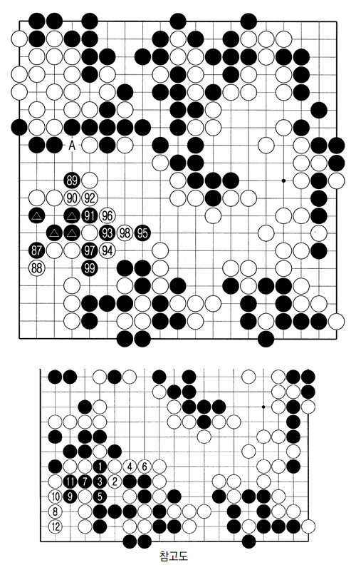 흑 ●의 생사를 둘러싼 전투가 이 바둑의 아마겟돈이다. 일단 흑 89가 활로를 여는 급소. 이 수가 있어 흑은 최소한 그냥 죽지는 않는 모양이다. 아울러 백 A로 끊는 노림마저 없앴다. 백 92로 잇는 것은 어쩔 수 없다.
