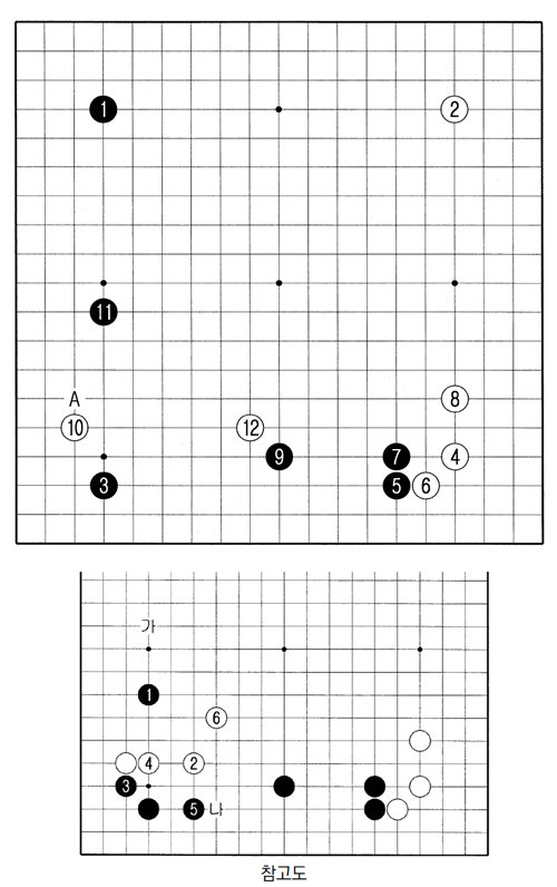 리는 흑 11부터 변화를 꾀했다. 다른 대국에선 참고도처럼 두 칸 높은 협공을 했다. 제로는 백 6까지 유연하게 응수했다. 이후 백은 ‘가’의 협공과 ‘나’의 붙임을 맞보기로 하고 있다.