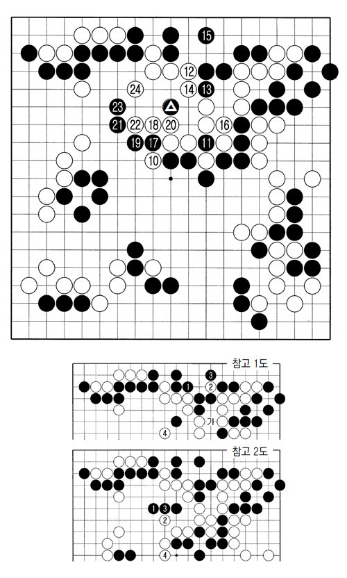 흑 11로 때려내자 백은 12, 14로 상변부터 보강한다. 흑 15로 물러나서 받은 것은 정수다. 참고 1도 흑 1처럼 꽉 막는 것은 백 2가 선수여서 ‘가’로 끊는 수단이 사라진다. 실전처럼 둬야 백 16의 연결이 필요하다.