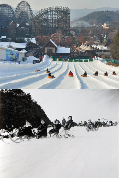 에버랜드 눈썰매장 스노우 버스터의 현재 모습-1988년 용인 자연농원 시절 눈썰매장 모습(아래). 사진제공|에버랜드