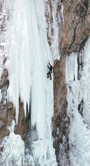 동호인 한 명이 낭떠러지를 덮은 얼음을 거슬러 오른다. 손에 쥔 아이스바일이 얼음을 칠 때마다 둔탁한 소리와 함께 조각이 아래로 튄다.