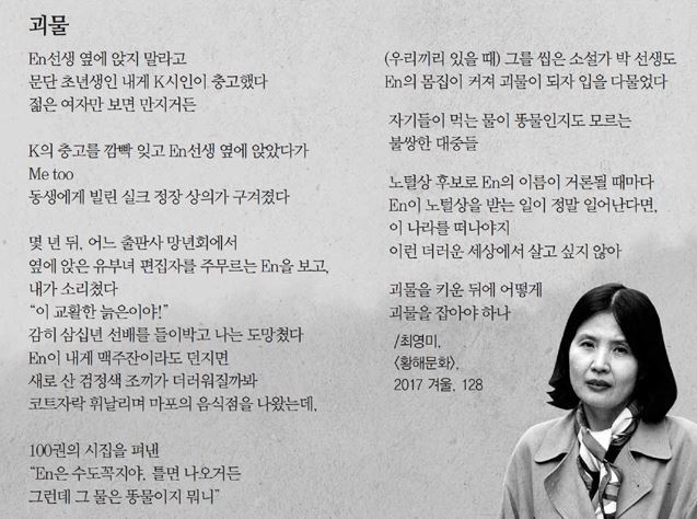 앞서 전날 온라인에선 최영미 시인이 쓴 ‘괴물’이라는 제목의 시가 화제가 됐다. ‘괴물’은 지난해 12월 계간 ‘황해문화’ 겨울호에 게재된 것이다.