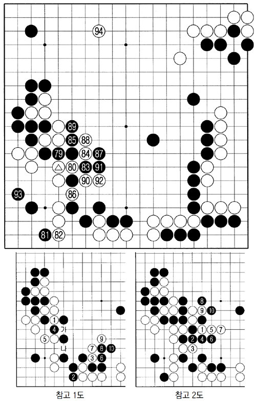 흑 79는 달콤한 수. 중앙 백 6점이 완전히 고립됐다. 물론 백 80으로 나와 하변 흑도 엷어지긴 했다.