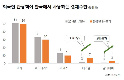 외국인 VIP관광 전문여행사 코스모진(대표 정명진)의 자료에 따르면 1분기 방한 외국인의 결제수단 중 모바일 결제 비중은 10%로 2016년 3%에 비해 3배 넘게 늘었다.