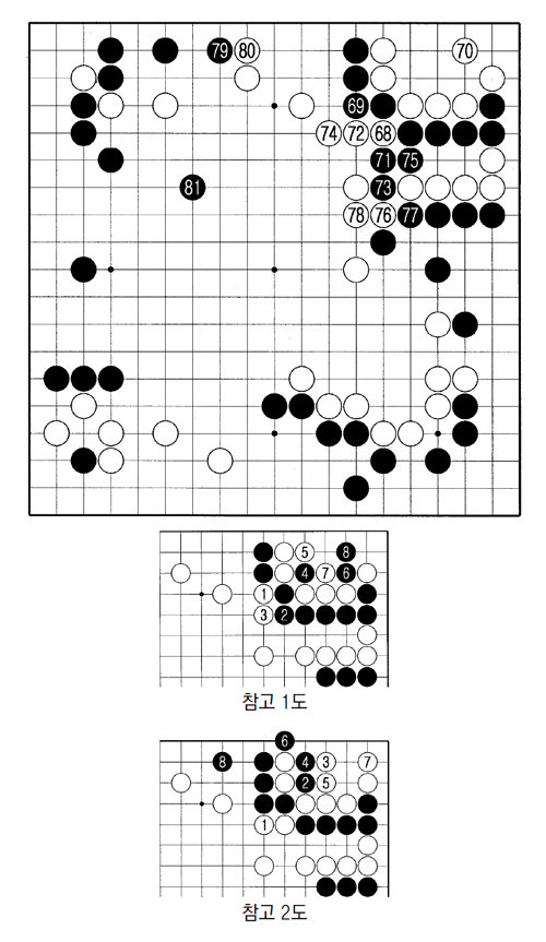 흑이 71, 73으로 나와서 수상전 형태가 됐다. 백 74는 급한 와중에도 침착함을 잃지 않은 수. 일단 두텁게 상변 흑을 제압하겠다는 것이다.