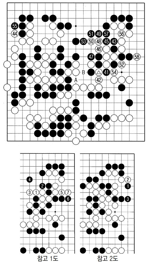 백 ○가 사실상 결정타. 흑 A로 나오는 것이 백의 유일한 약점이었는데 백 ○가 있기 때문에 B로 늦춰 받는 수가 생겼다. 흑 A가 선수가 돼야 우상 백을 더 공격할 수 있는데 지금은 만사휴의. 흑 41부터는 마지막 확인 작업에 가깝다.