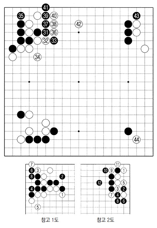 좌하귀가 일단락되자 흑은 미완으로 남겨둔 우상 쪽부터 손을 댄다. 흑 43에는 참고 2도 백 1로 막는 것이 보통이다. 흑 12까지의 정석은 서로 무난한데 백은 손을 빼고 44로 우하 귀 3·3으로 들어간다. ‘손 빼기’를 좋아하는 알파고의 습성이 고스란히 묻어나는 수다.